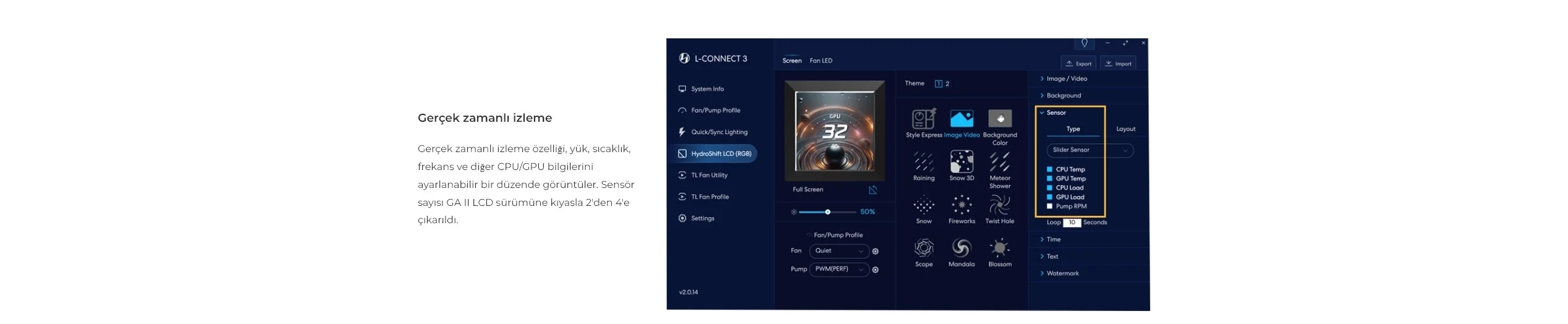 HydroShift AIO sürümü, Atmosphere, Planet City ve Steampunk gibi birden fazla temaya sahip L-Connect 3 güncellemelerini getiriyor ve ayrıca GA II LCD serisiyle de uyumlu. Bu temalar, donanım izleme için benzersiz görseller ve önceden ayarlanmış düzenler sunuyor.