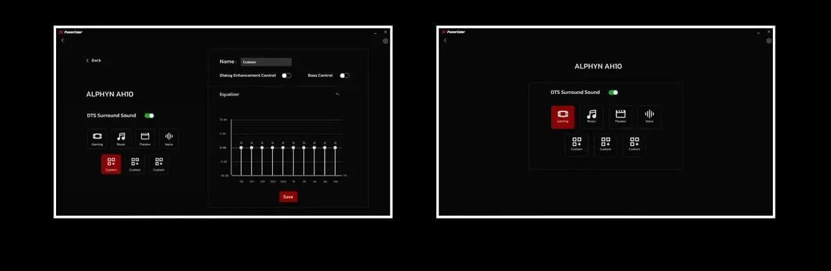 ALPHYN AH10 kulaklık, her biri aktiviteye göre ses deneyiminizi optimize etmek üzere tasarlanmış üç dahili ses moduyla donatılmıştır: Oyun, Müzik ve Tiyatro. Ayrıca, PowerColor Keystone yazılımı, gelişmiş daldırma için ince ayarlanmış dört ek DTS ses profili sunar. Yazılım ayrıca, ses ayarlarınızı kişiselleştirme esnekliği sağlayan üç kullanıcı tanımlı mod içerir.
