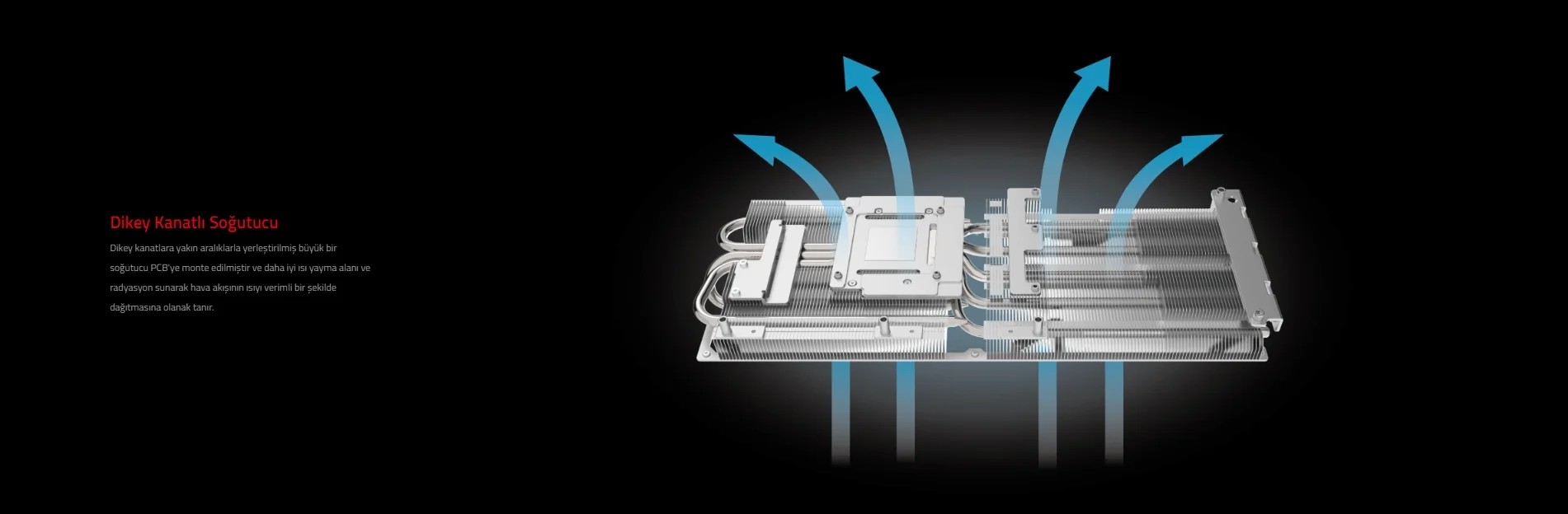 5 x 6φ nikel kaplı bakır ısı boruları PCB'nin üzerine yakın bir şekilde hizalanarak ısının GPU ve VRAM'den soğutma dizisine daha hızlı ve etkili bir şekilde aktarılmasını sağlar.