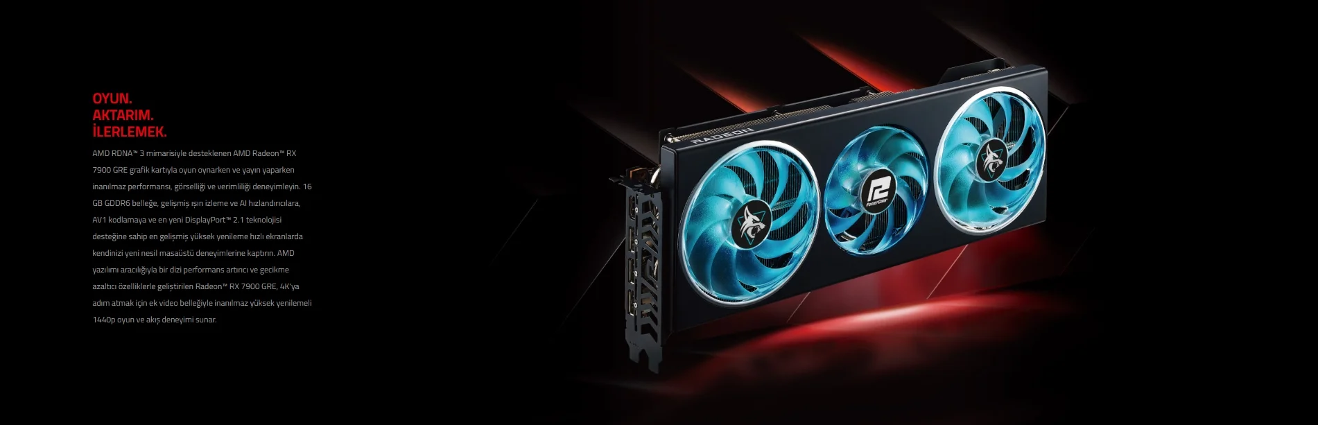 AMD RDNA™ 3 mimarisiyle desteklenen AMD Radeon™ RX 7900 GRE grafik kartıyla oyun oynarken ve yayın yaparken inanılmaz performansı, görselliği ve verimliliği deneyimleyin. 16 GB GDDR6 belleğe, gelişmiş ışın izleme ve AI hızlandırıcılara, AV1 kodlamaya ve en yeni DisplayPort™ 2.1 teknolojisi desteğine sahip en gelişmiş yüksek yenileme hızlı ekranlarda kendinizi yeni nesil masaüstü deneyimlerine kaptırın. AMD yazılımı aracılığıyla bir dizi performans artırıcı ve gecikme azaltıcı özelliklerle geliştirilen Radeon™ RX 7900 GRE, 4K'ya adım atmak için ek video belleğiyle inanılmaz yüksek yenilemeli 1440p oyun ve akış deneyimi sunar.TEKNİK ÖZELLİKLER